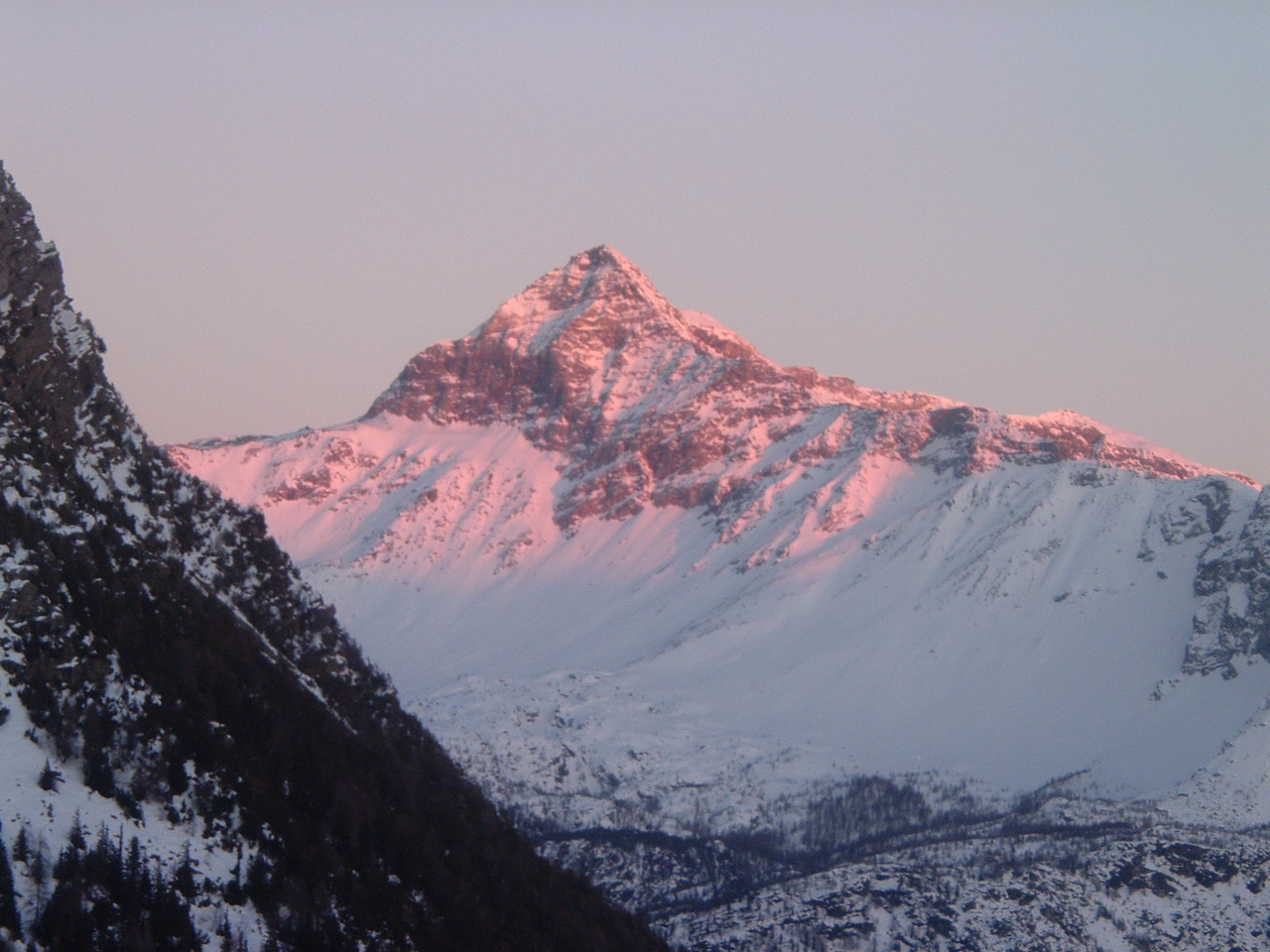 Non meno noto per gli alpinisti e le guide il Pizzo Scalino, 3300 metri, che in questa immagine vediamo al tramonto. Anche questa cima è una conquista immancabile ogni anno per chi ama la montagna ed è sufficientemente preparato per affrontare il ghiacciaio o i passaggi più difficili nel caso di salita dal passo degli ometti o dalla cresta dei Galli.